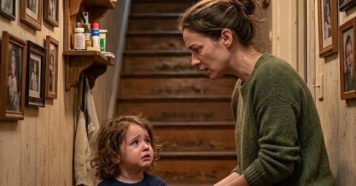 אמילי עמדה מאחוריה, גוררת את הארנב שלה. – אמא למטה – אמרה בשקט.