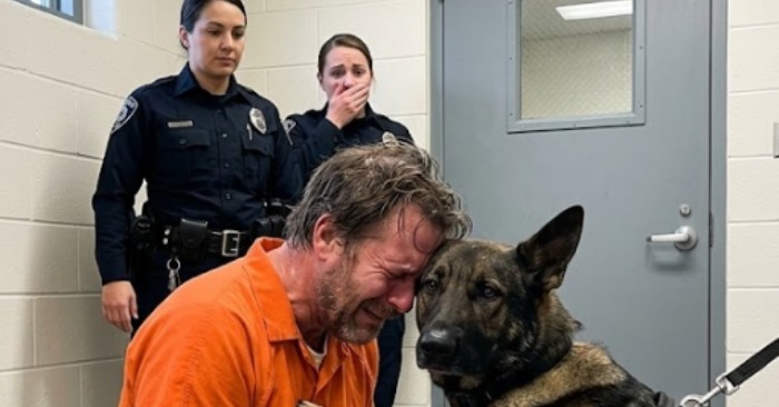 באותו רגע משהו נשבר בתוך אית'ן. הוא התכופף קדימה ככל שהאזיקים אפשרו, וטמן את פניו בפרוות הכלב. כתפיו רעדו, נשימתו הפכה לא אחידה. זה לא היה בכי רגיל — שנים של כאב פרצו החוצה.